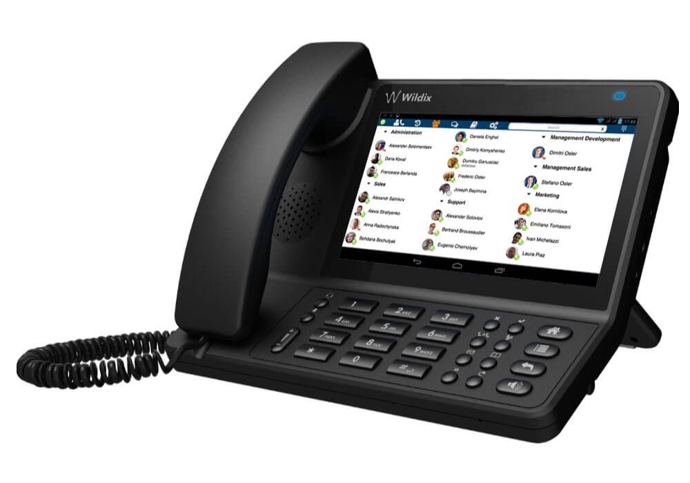 Telefono Wildix vision ,nero, rigenerato. E' un telefono fisso VoIP Android per manager, ideale per videoconferenze grazie al display touchscreen da 7'' (1024x600) e webcam da 2MP, con funzionalità avanzate come WebRTC, presenza e chat, supporto Wi-Fi, Bluetooth, USB-C e grandi tastiere BLF per monitorare lo stato dei colleghi, integrandosi perfettamente con il software di comunicazione Wildix.